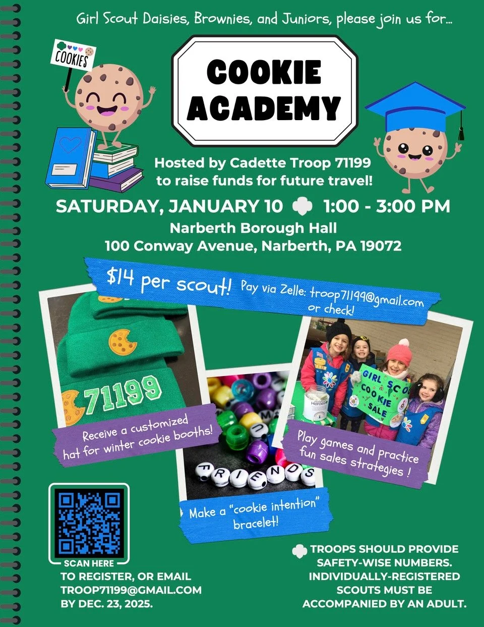 Looking for fun ways to get your Daisies, Brownies, and Juniors pumped up to sell cookies? Join us for our Cookie Academy Cookie Rally on January 10 1-3pm at Narberth Borough Hall! Troop 71199 will lead interactive activities with your girls, including cookie games and skits, a cookie rap song, cookie taste testing, cookie booth poster making, a personalized bead bracelet, and custom winter cookie hat!