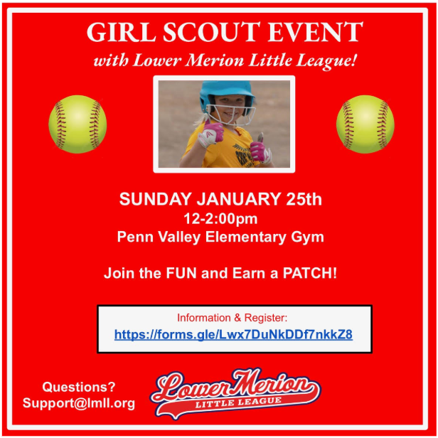 Sign up here to learn softball with Lower Merion Little League ! Coaches and older Juniors and Cadettes will be working with Daisies and Brownies to go over skills and introduce kids to the game! Girls should wear sneakers, and bring a glove, bat, helmet if you have one, if not there will be some to borrow. No experience necessary and girls will get a patch at the end!